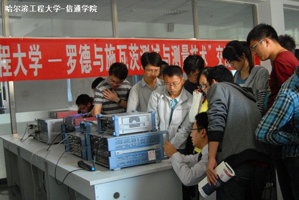 此次研讨会不仅包括主题讲座,还有最新测试测量仪器的前沿功能展示以及与“哈工程-中兴通讯联合NC实验室”的联合测试测量演示。紧邻396实验室的仪器展示区展示着近十台罗德与施瓦茨公司最新型的测试测量仪器,公司的产品支持工程师则针对观众们感兴趣的功能进行详细地讲解和演示。