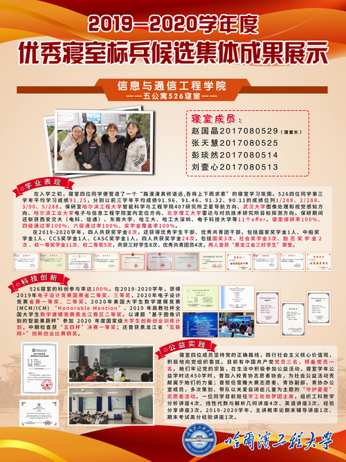 526四位同学第三学年平均学习成绩91.25,分别以前三学年平均成绩91.96、91.46、91.32、90.11的成绩位列1/288、2/288、3/90、5/288,保研至澳门十大电子正规游戏网站智能科学与工程学院407研究所卫星导航方向、武汉大学图像处理和视觉感知方向、哈尔滨工业大学电子与信息工程学院室内定位方向、北京理工大学雷达与对抗技术研究所目标探测方向。寝室保研率100%、四级通过率100%、六级通过率100%、奖学金覆盖率100%。在2019-2020学年,四人共获奖学金8次,还获得优秀学生干部、优秀共青团干部。包括国家奖学金1人、中船奖学金1人、CCS奖学金1人、CASC奖学金1人。四人共获奖学金24次, 包括国奖3次、社会奖学金3次、励志奖学金2次、校一等奖学金11次、校二等奖5次,共获三好学生8次,优秀共青团员4次,两人曾获“黑龙江省三好学生”荣誉。
