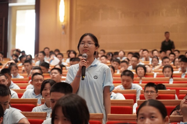 互动环节中,现场同学纷纷举手提问:“核潜艇能潜到多深?”、“女生适合从事船舶科研吗?”田小川教授一一耐心解答,并向提出问题的同学们赠送了自己的最新著作《向海图强》。结合军训的特殊契机,她强调,“军训锤炼的是意志,而国防科技需要的是坚守。”希望同学们传承前辈们的坚守与奉献,用青春诠释好“中国造船 深蓝止戈”的时代内涵——强大的船舶工业不仅是国家经济实力的体现,更是维护海洋权益、守护世界和平的底气。