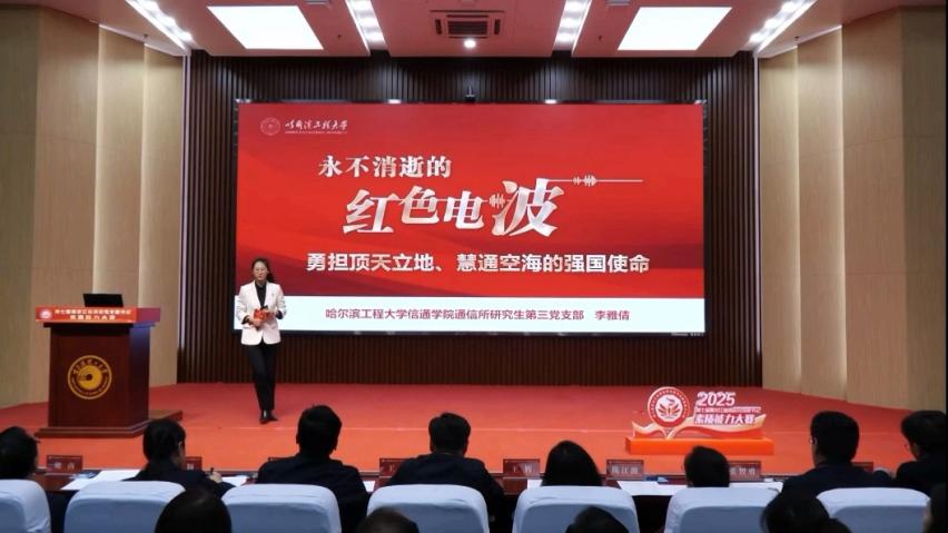李雅倩以《永不消逝的红色电波》为题,讲述从哈军工到哈工程,从长空到深海,从追赶到领跑,一代代青年践行“想的是党、为的是国、强的是军”的哈军工精神,以“红色电波”承载忠诚与担当,勇担顶天立地、慧通空海的强国使命。
